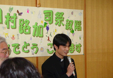 出身教会である多摩教会で 田村路加神父様初ミサ 2003年3月9日 主任司祭のごあいさつ 説教 聖体拝領 多摩教会からカリスが贈られました 花束の贈呈 田村神父様のごあいさつ 派遣の祝福 信徒館で祝賀会 あらためて田村神父様のごあいさつ 子供さんたちから手紙入り首飾りを贈る シスターから贈られたケーキに入刀 最後に祝福をいただいて閉会しました いつまでもお元気で